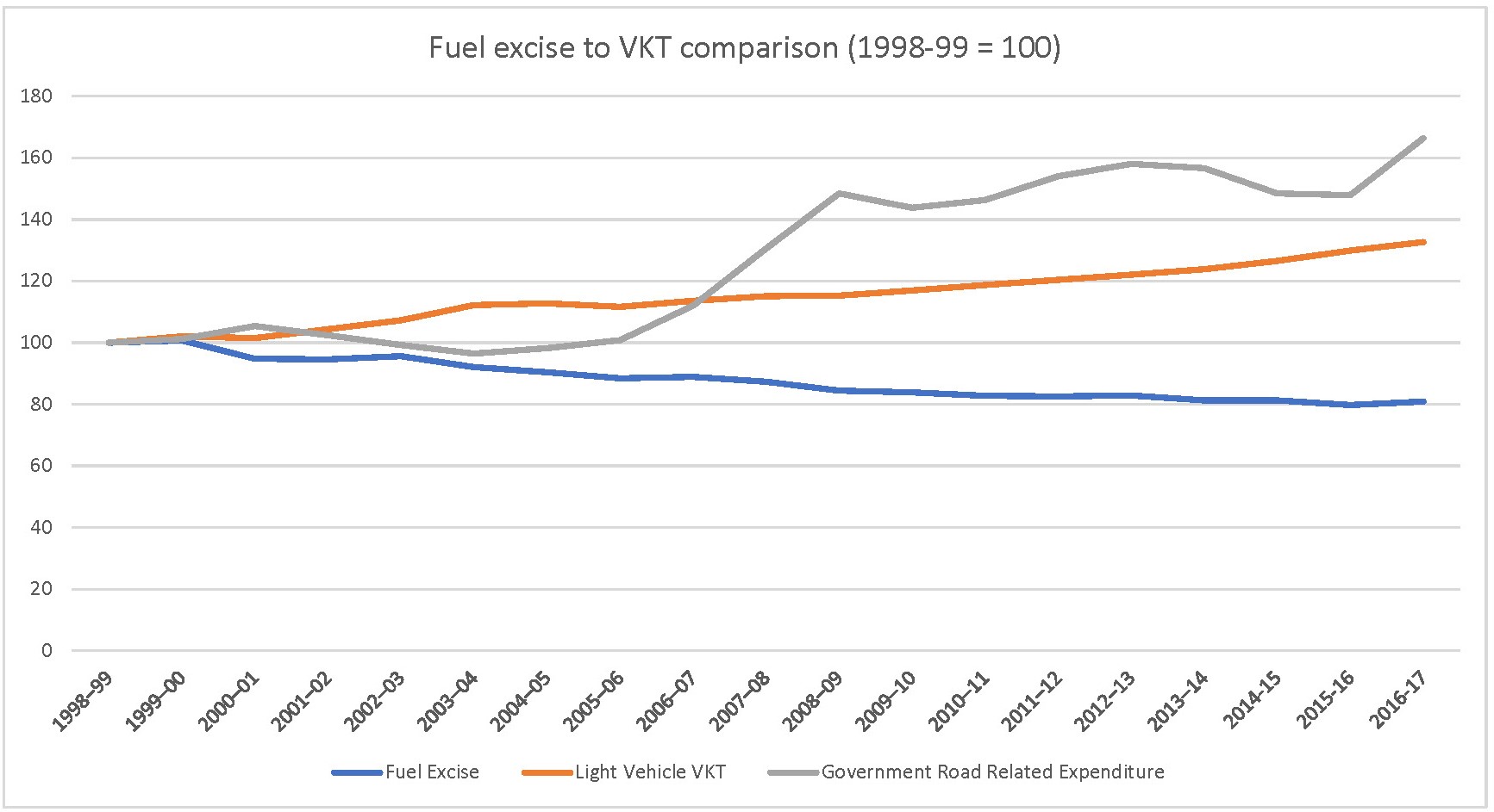 Figure 1: Comparison of net fuel excise revenue, VKT and road related expenditure